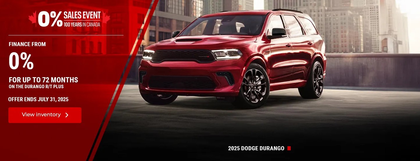 0% financing up to 72 months on new and previously unregistered 2025 Dodge Durango R/T Plus models, at participating retailers in Canada until July 31, 2025, on approved credit. Example: 2025 Dodge Durango R/T Plus priced at $81,904 with a $0 down payment, financed at 0% for 72 months equals 72 monthly payments of $1,138 with a cost of borrowing of $0 and a total obligation of $81,904. The price represents the Manufacturer's Suggested Retail Price ("MSRP") plus freight, any applicable dealer administration fees of up to $700, federal A/C surcharge, applicable green levies, Luxury Tax surcharges (if applicable), Lien registration fee (up to $219, including registering agent fee, where applicable) and all other fees, levies, and duties (all of which may vary by region and detailer, minus any current Manufacturer Discounts, which allow the dealer to sell for less. License, registration, insurance, specific duty on new tires (up to $15, in Quebec only), and applicable taxes are extra and will be due at signing. Your dealer may charge a Luxury Tax surcharge on vehicles priced over $100,000 under the Government of Canada's Select Luxury Items Tax Act. The actual value of the Luxury Tax surcharge will be calculated based on the vehicle's final negotiated selling price (before applicable taxes), and will represent the lesser of: (i) 10% of the vehicle's selling price; or (ii) 20% of the final negotiated selling price that exceeds the $100,000 threshold. Please see your dealer or visit the Government of Canada's website for further details. Offer may be modified or terminated without notice. A deposit may be required. Dealer trade may be necessary (where applicable), but may not be available in all cases. Dealers may sell for less. See dealer for complete details. Learn more from your dealer or by visiting Build & Price. All other Trims/Models are excluded. Ends July 31, 2025.